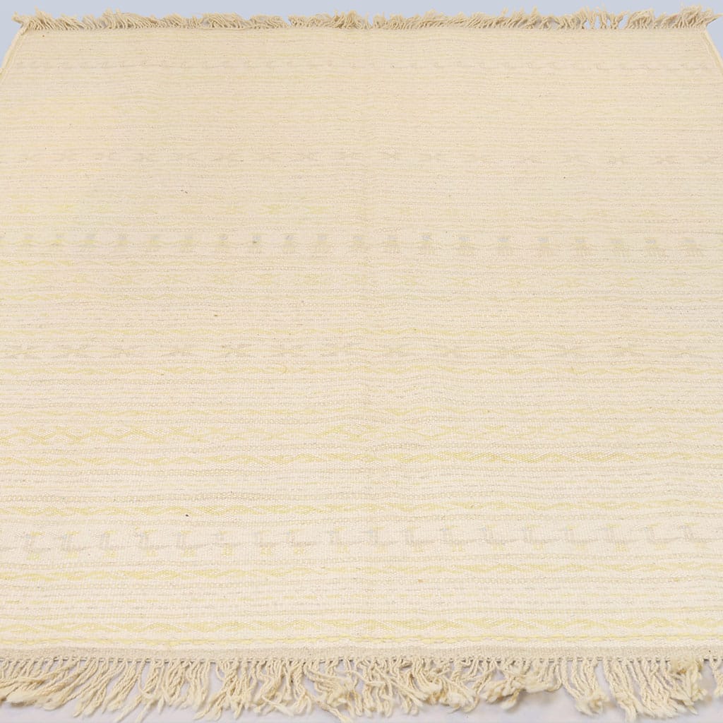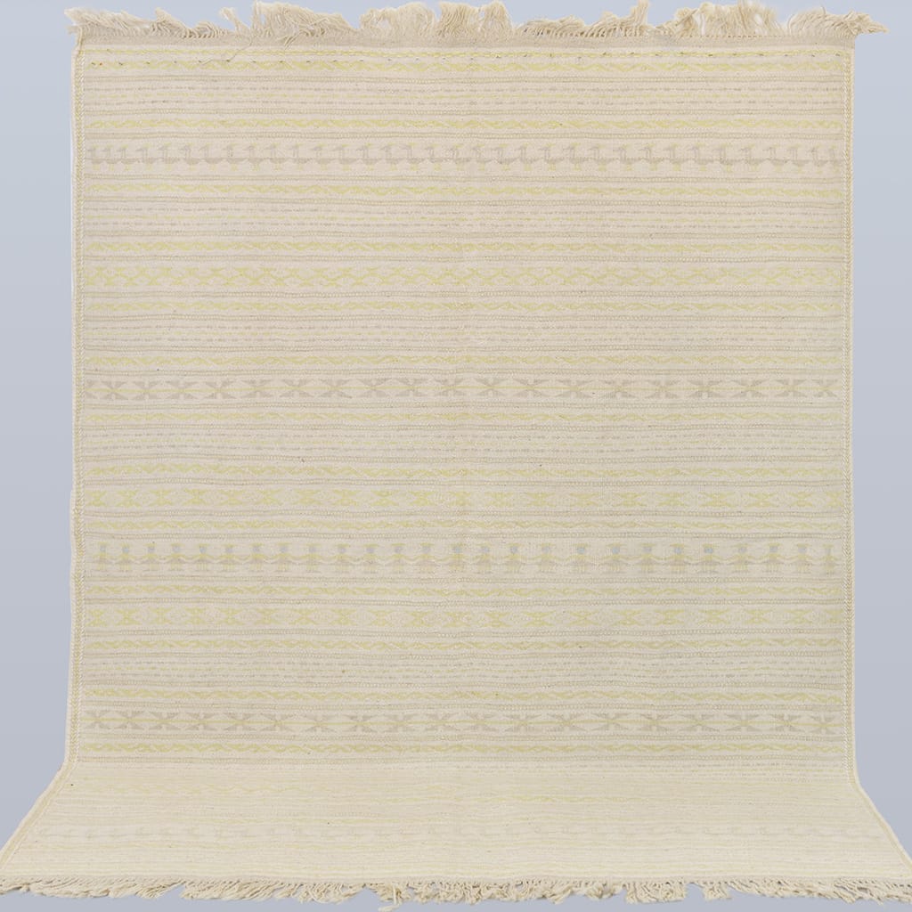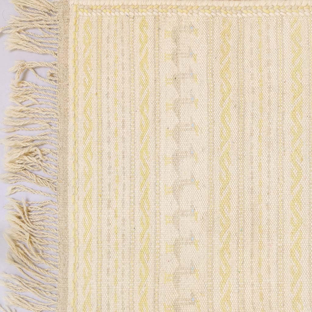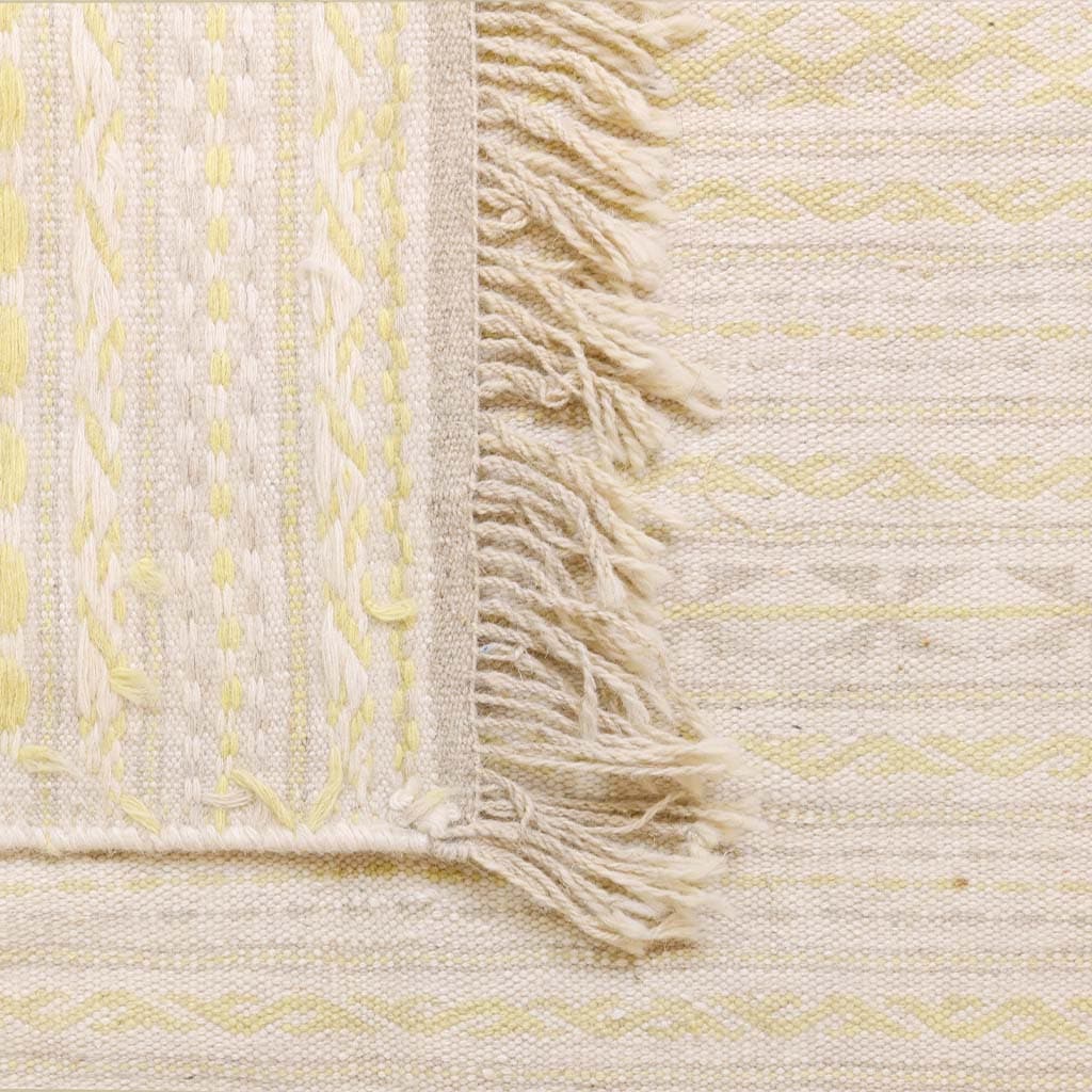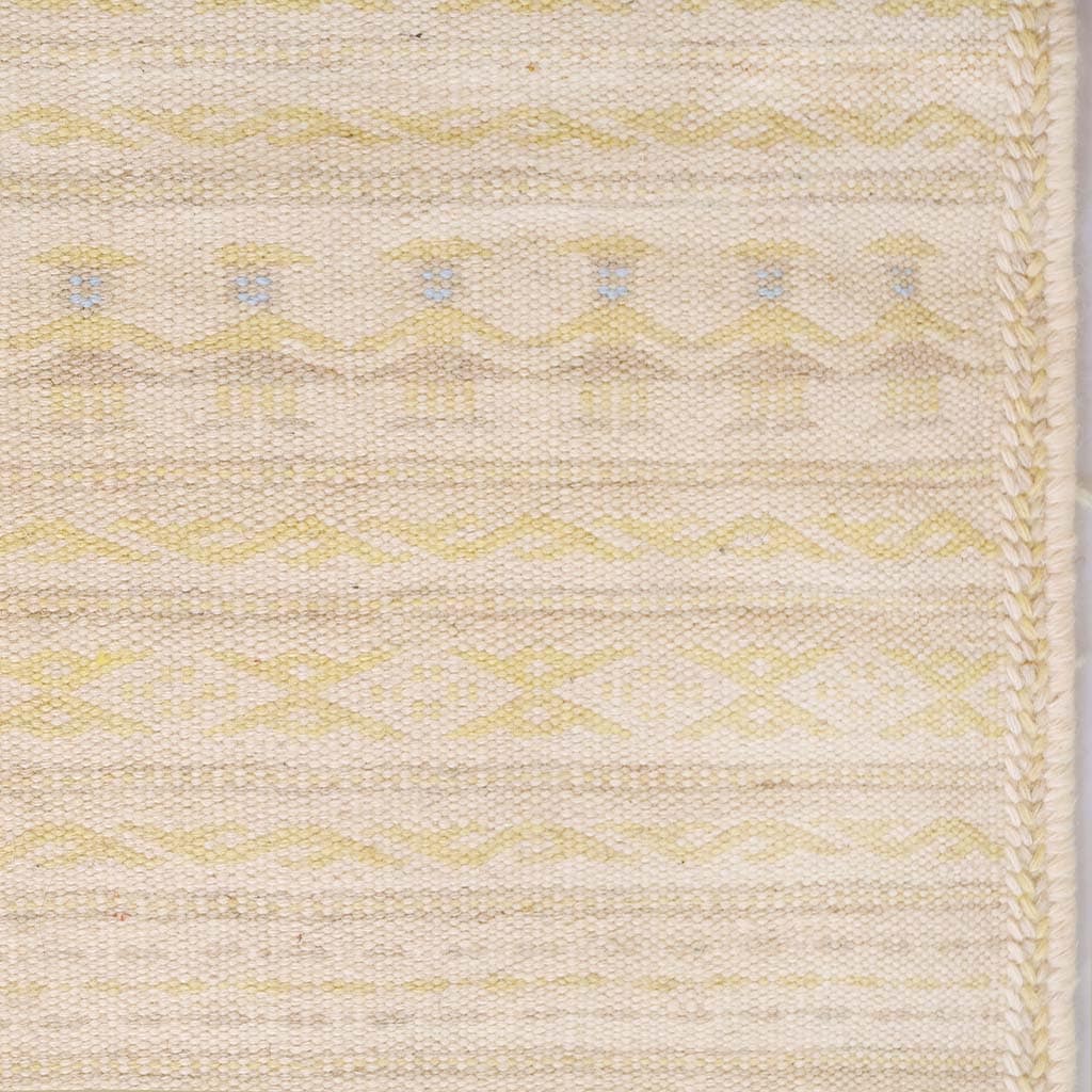 Den här väl avvägda kombination av färger har valts för att vara mjuk och harmonisk i ditt hem. Handvävd och helt gjord i ull. Den passar utmärkt för att lyfta ett skandinaviskt hem. Klassiskt Adrina-mönster med inspiration från svensk natur och midsommar. Små färgklickar av blått för att ge den liv.
