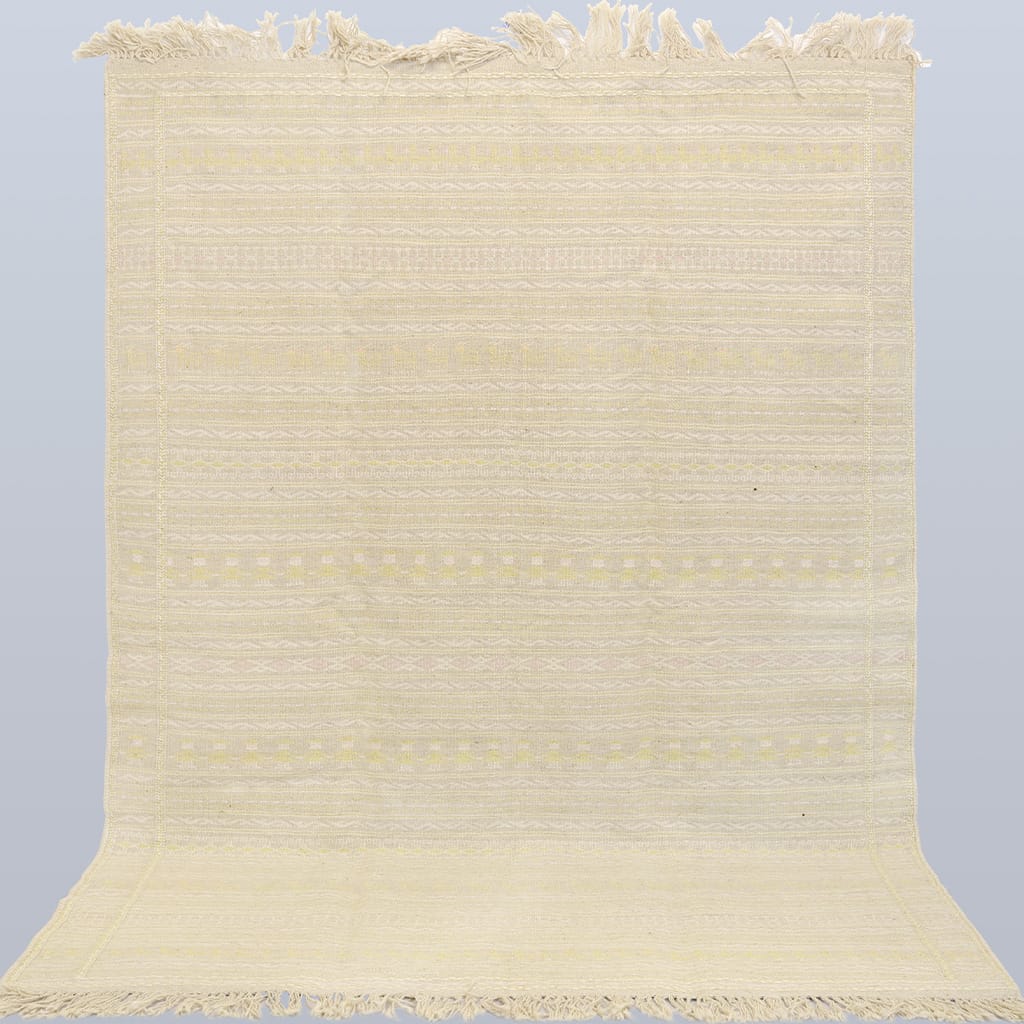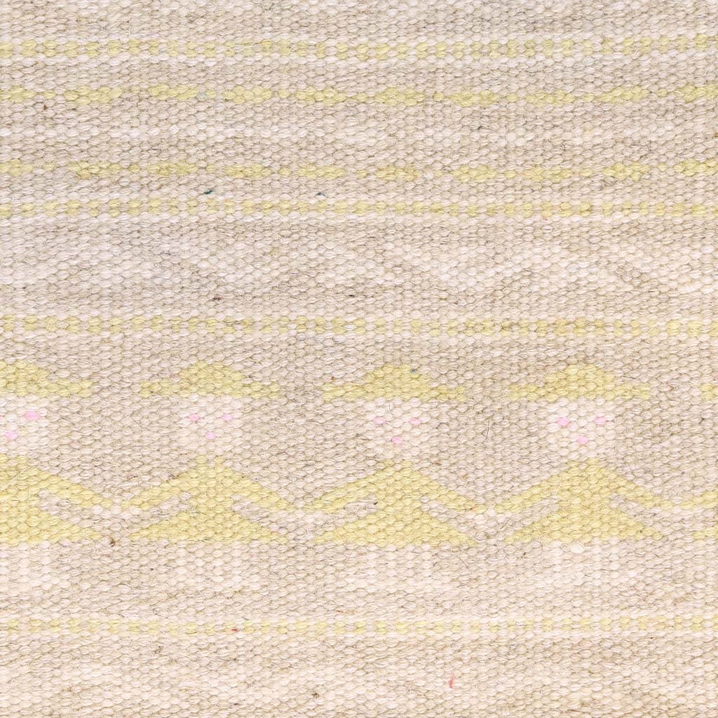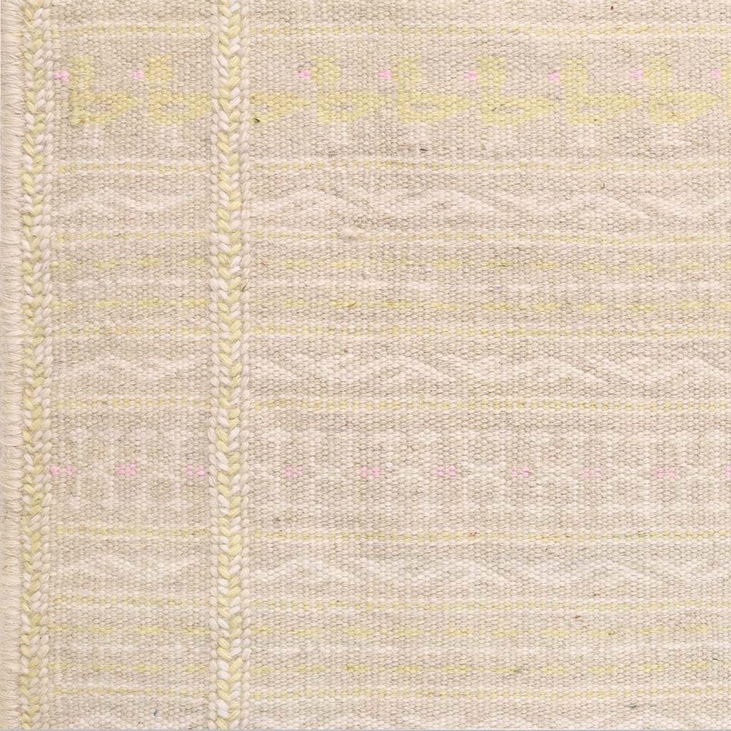 Adrina i en lugn färgkombination som inte tar över rummet. Fina små rosa detaljer av silkesinslag. Inspiration från Nomad Kelim med en skandinavisk twist, handvävd i 100% ull.