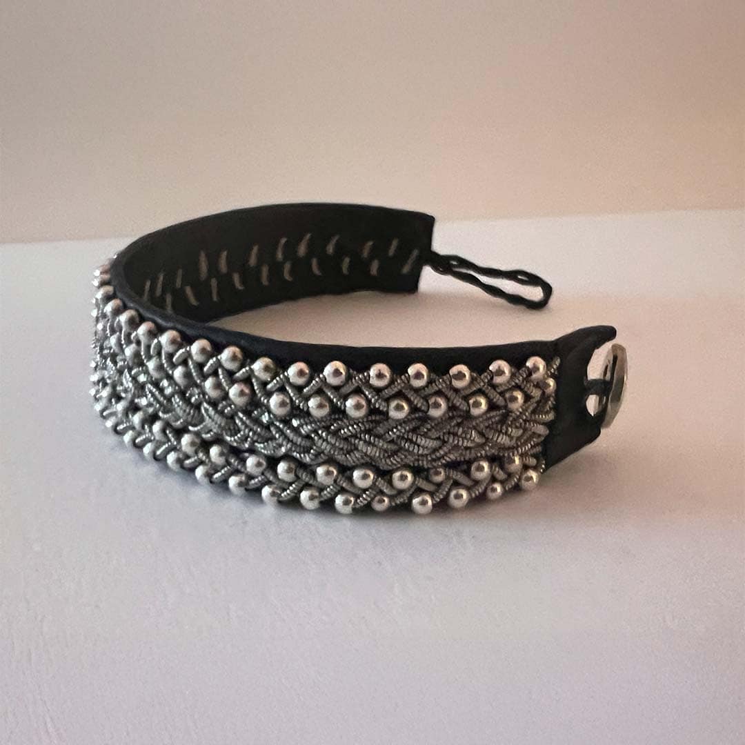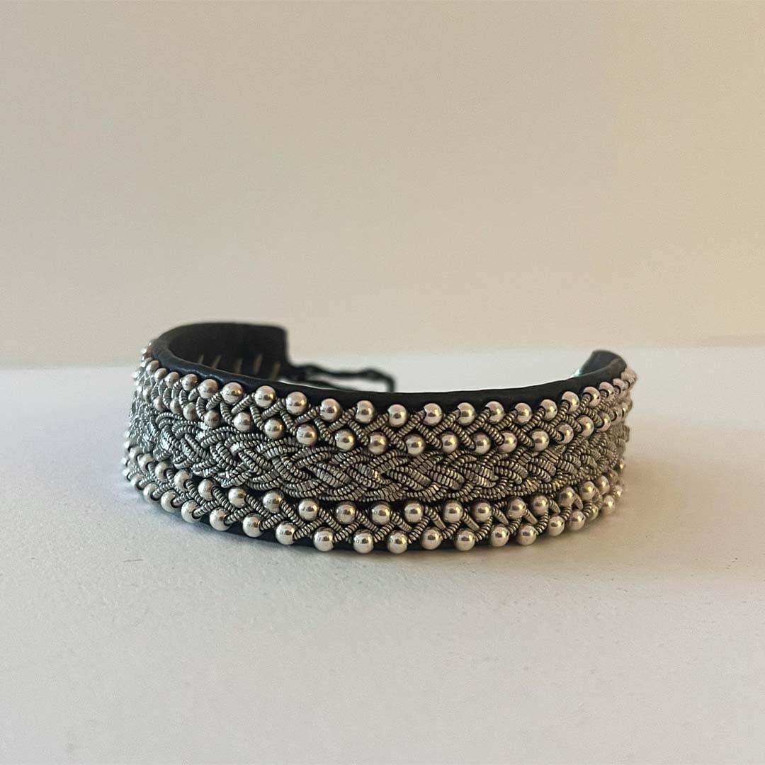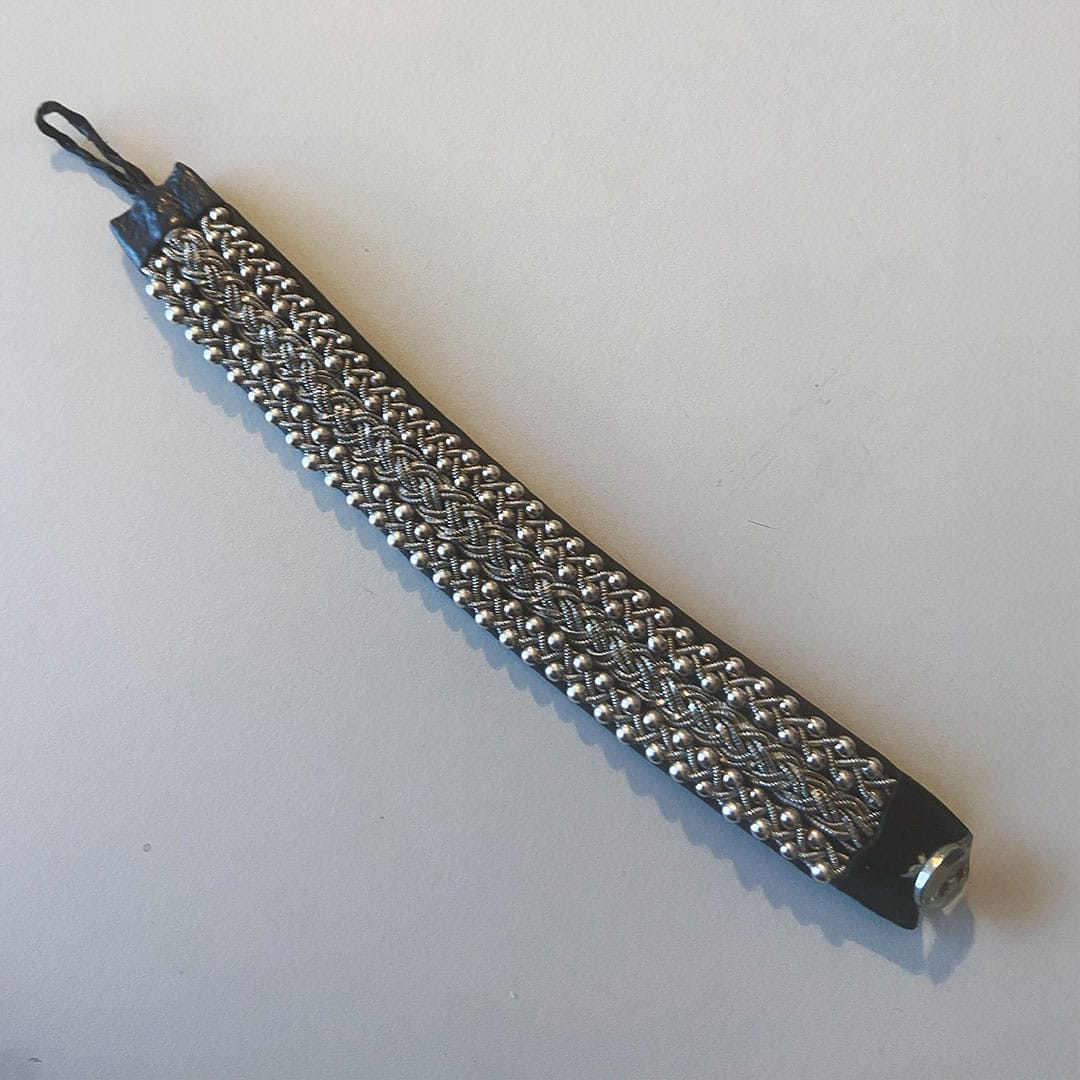 Ett brett, exklusivt handgjort armband i äkta skinn med tenntrådsbroderier och knapp i silver. Finns i flera färger på lädret och tillverkas på beställning efter ditt handledsmått för optimal passform.