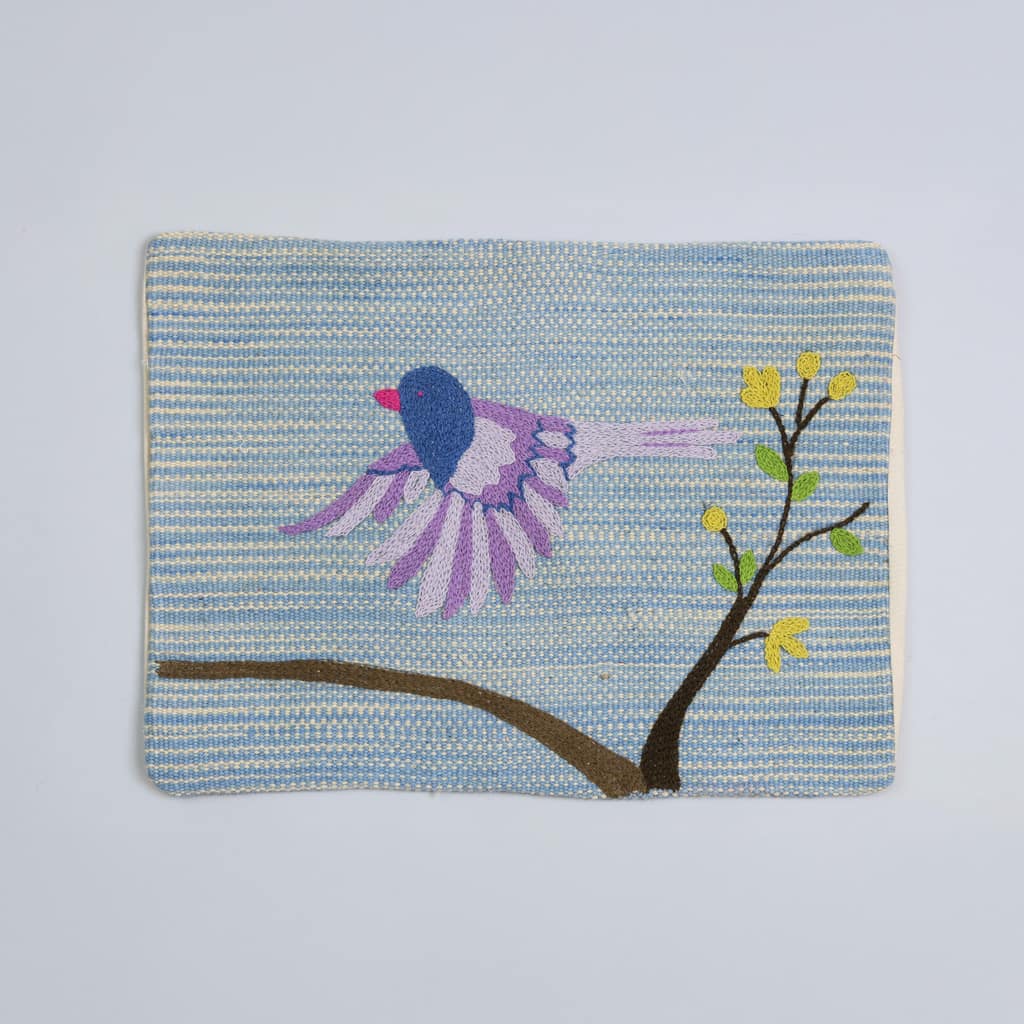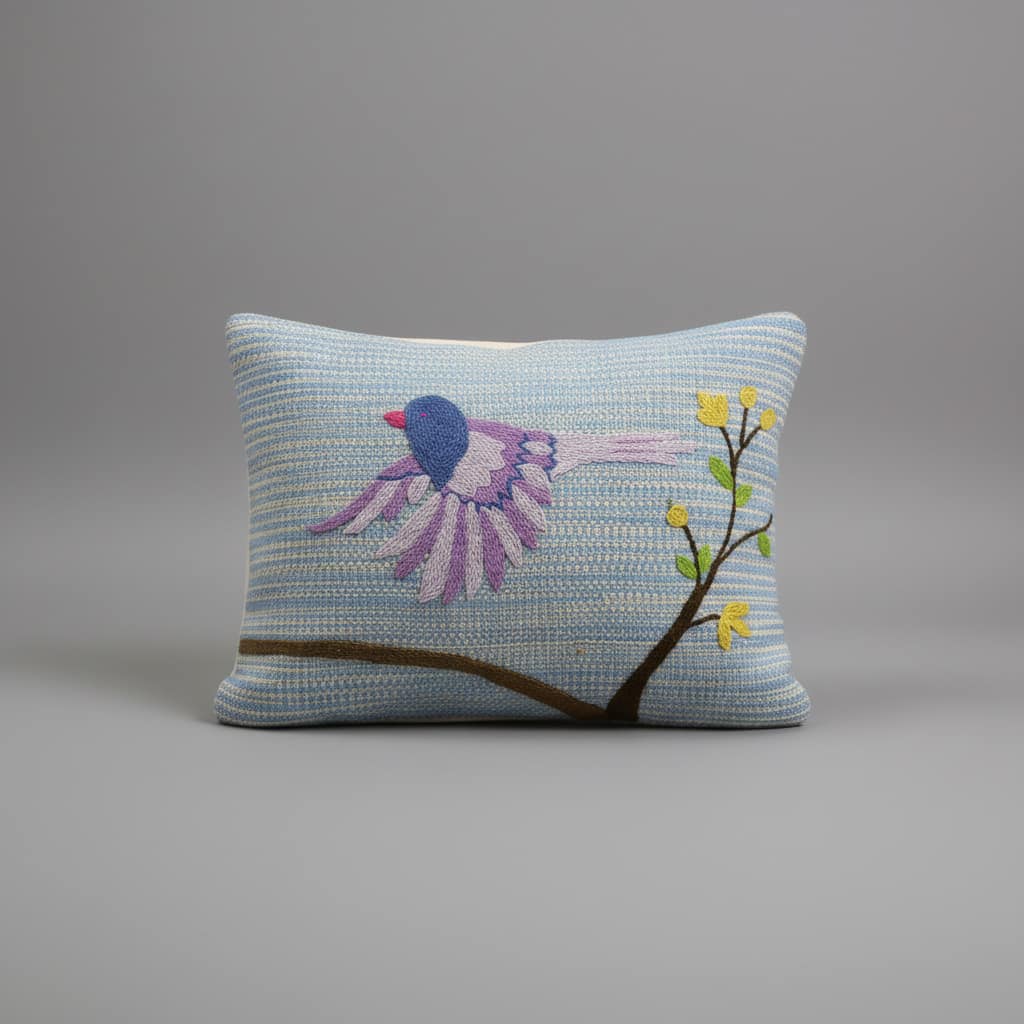 Handvävt kuddfodral med handbroderad dekor av en flygande fågel, inspirerad av äldre svenskt broderi och utförd i harmoniska toner.