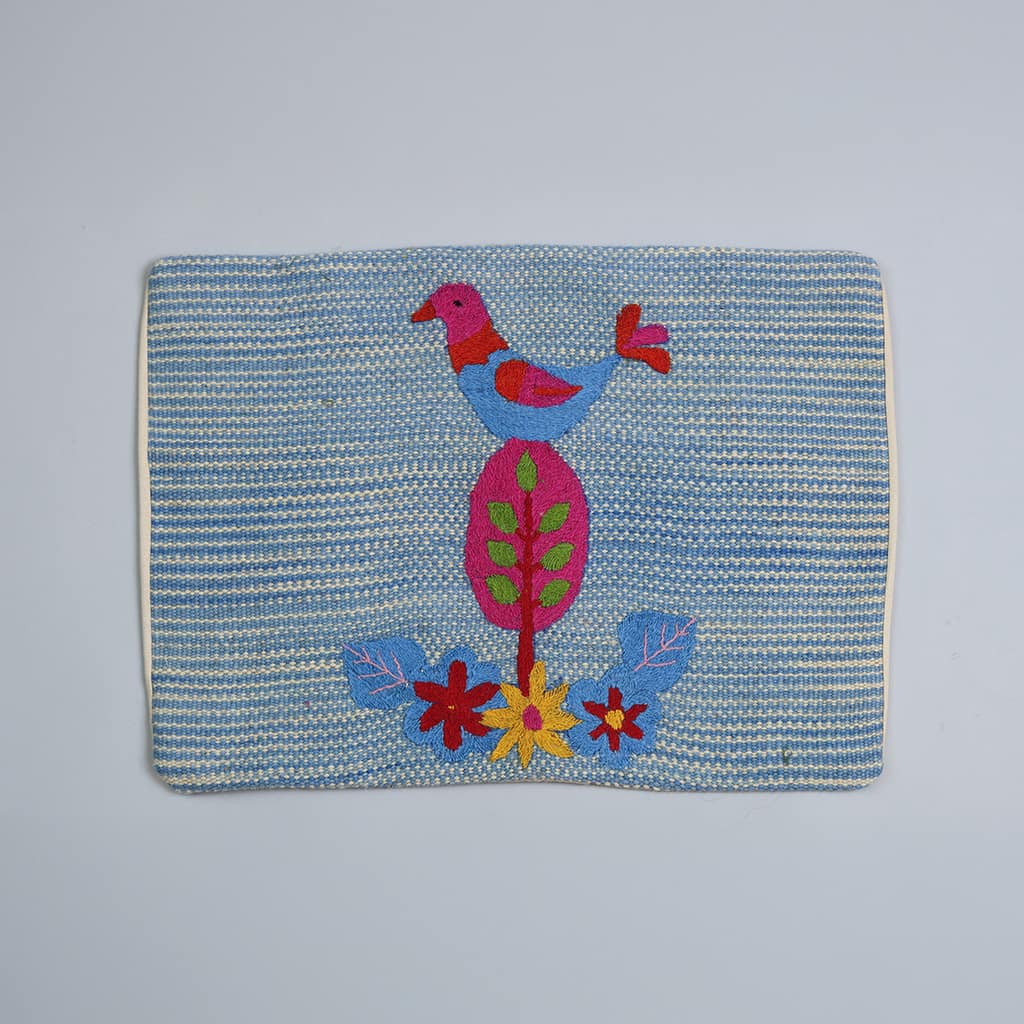 Handvävt kuddfodral med handbroderad dekor av en stiliserad fågel, inspirerad av äldre svenskt broderi och utförd i färgstarka men harmoniska toner