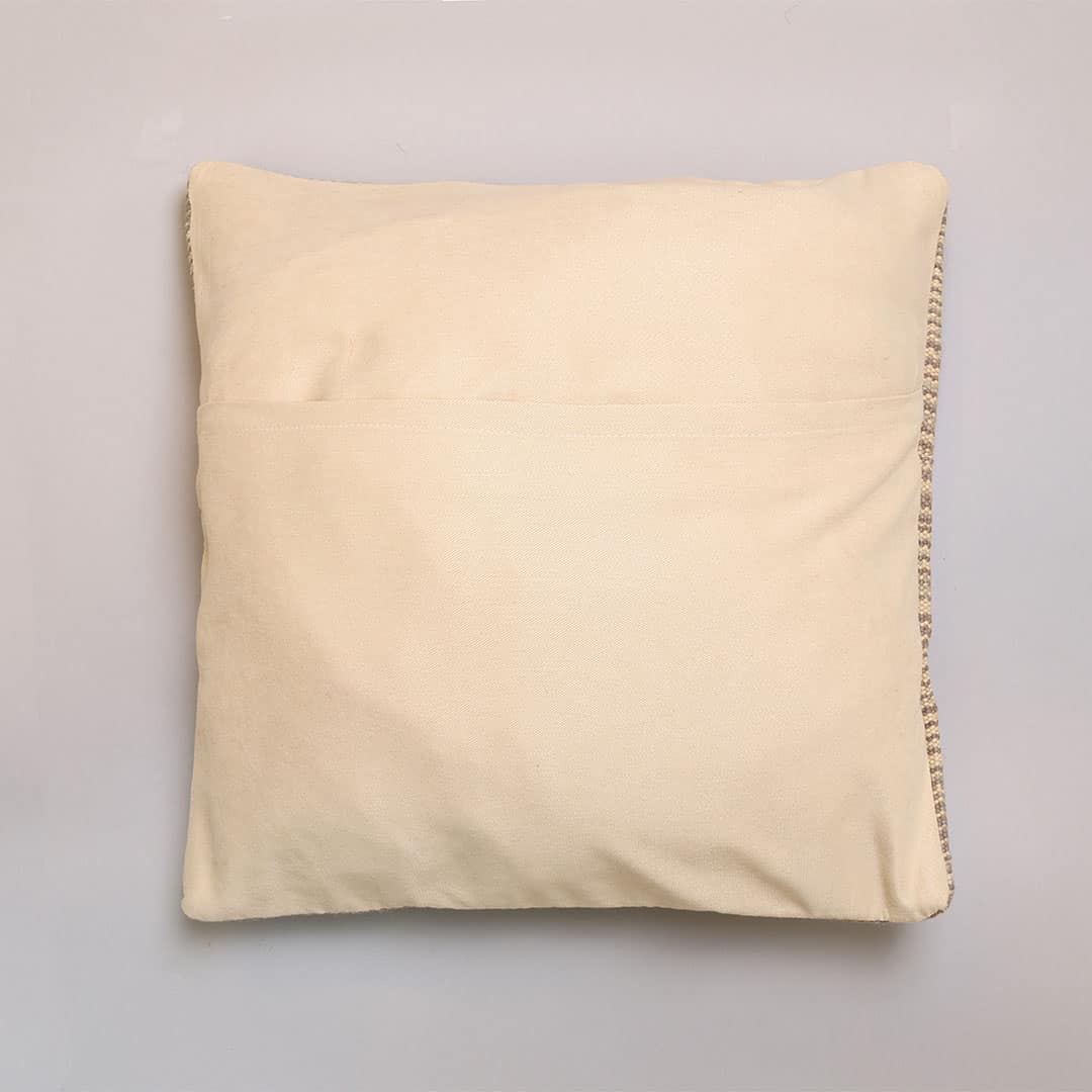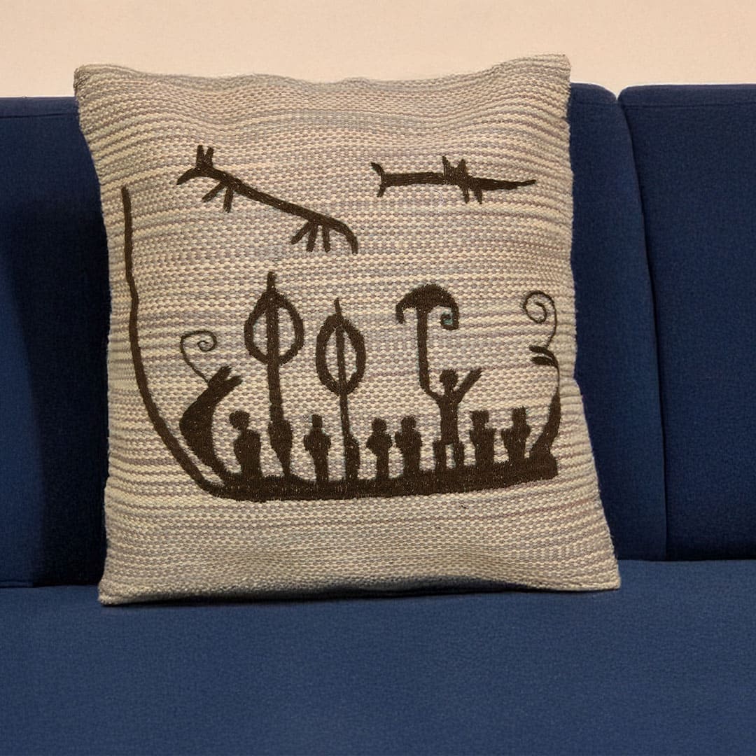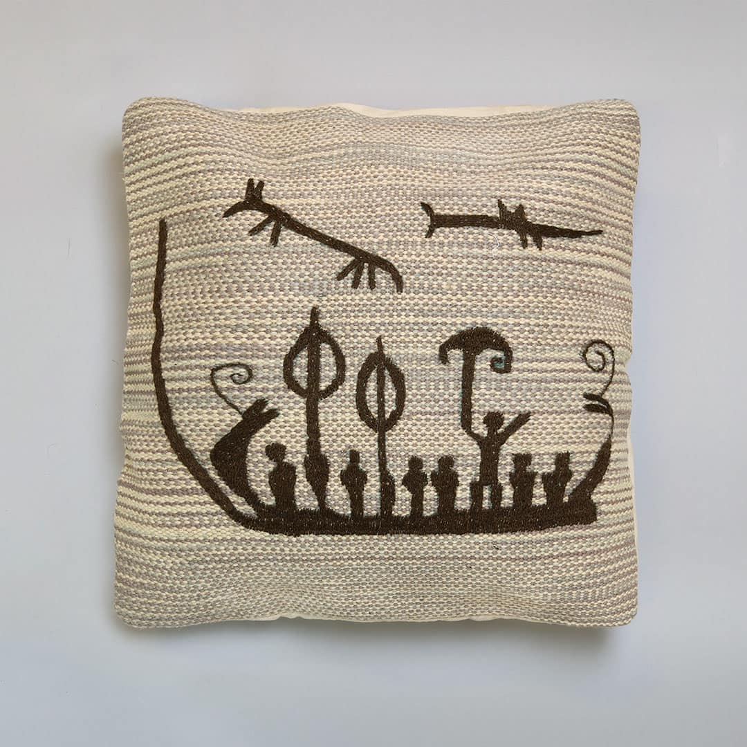 Handvävt kuddfodral med handbroderad dekor i naturfärger.